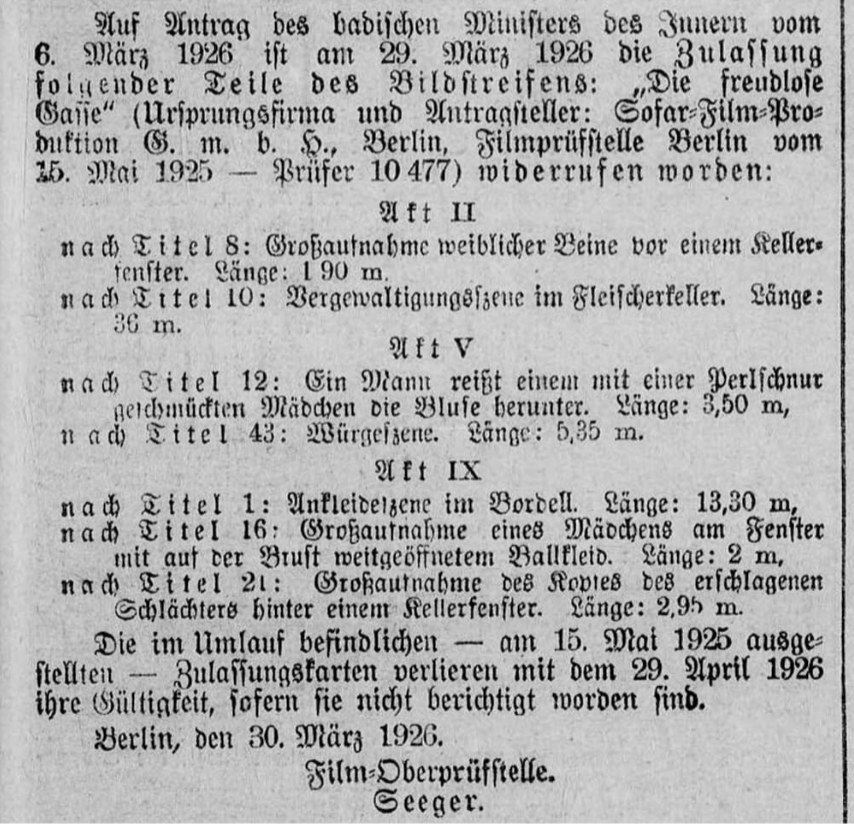[61] Film-Oberprüfstelle Berlin: Niederschrift zur Verhandlung über den Antrag der Badischen Regierung auf Widerruf der Zulassung des Bildstreifens “Die freudlose Gasse”; Berlin, Mar. 29, 1926. The cuts ordered by the board amounted to 65 meters (about three minutes), reducing the total length to 3,477 meters.