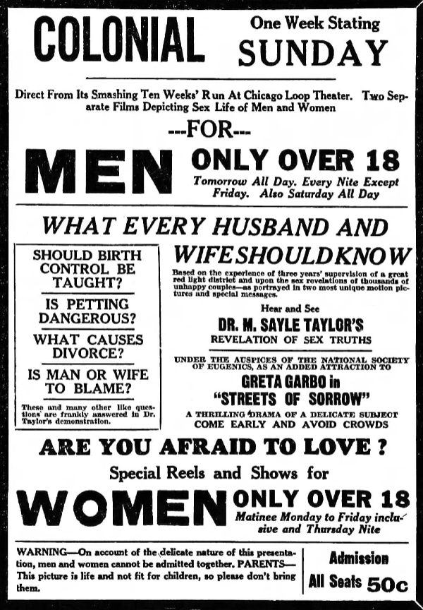 By the time the film got over here in 1926–27, it had been recut to make Garbo the lead, with Nielsen practically eliminated. At that time, the film, which had heavy sex angles due to depressed conditions of post-war Vienna which it depicted, had been arranged with subtitles as an “exposé of prostitution,” and was shown in Midwestern houses on alternate days for men and women only, with sex talks by Dr. M. Sayle Taylor, since become famous as “Voice of Experience” on the airways. Recently reissued by an indie outfit, the film is currently showing at Criterion, Los Angeles, a bootleg house featuring the indie Children of Loneliness, a film on lesbianism. Streets of Sorrow runs to four reels, with dialogue and commentary dubbed in. Not only does the commentator poke copious fun at the film, but actors are made to speak in various dialects, foreign accents, and humorous voices.[80]