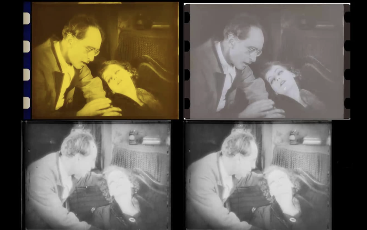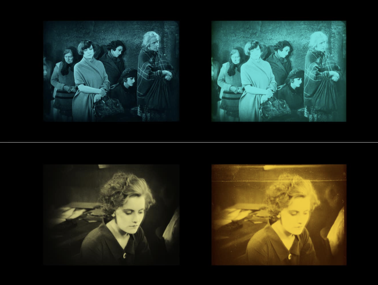 Jan-Christopher Horak, who who took over the management of the Munich Filmmuseum in 1994, continued the reconstruction of The Joyless Street with support from the European Lumière Project. The result was a negative of the reconstructed version, produced at the laboratory “L’Immagine Ritrovata” in Bologna. As source materials, original nitrate prints from the Library of Congress, the George Eastman House, the Cineteca Italiana in Milan, and the Cinémathèque française were incorporated, along with two small reels of outtakes from the collection of the Deutsche Kinemathek.[96] Since three of the materials were consistently tinted—though the choice and transitions of the partially faded and time-altered colors differed considerably—a concept was developed for tinting the reconstructed version using the Desmet method.