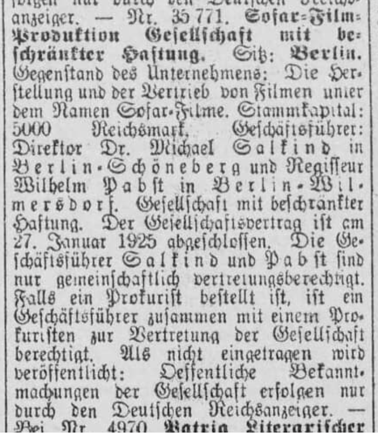 [48] Reichsanzeiger Nr. 250, 24.10.1925. In 1927 Hans Hirschel withdrew. From Jan. 20, 1927 onward the company continued as “Sofar Verleih GmbH,” with an increase in share capital, and was liquidated at the end of the year. Serious irregularities led to the dissolution of the firm (“Zusammenbrüche in der deutschen Filmindustrie”; Das Kino-Journal, Vienna, Oct. 5, 1929, p. 5).