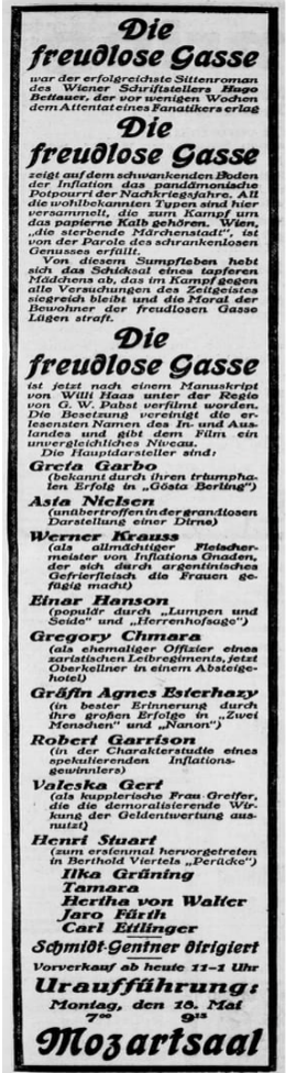 [12] “Die freudlose Gasse”; Tages-Post, Linz, Mar. 2, 1924, p. 22 / Heinz Michaelis: “Die freudlose Gasse”; Film-Kurier No. 117, May 19, 1925 / “Filmbesprechungen”; Neue Freie Presse No. 21971, Nov. 18, 1925, p. 8.